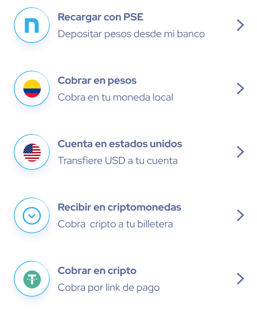 Puedes pagar servicios públicos, servicios de streaming, plataformas digitales, entre otros. Además, tener una cuenta en COP, USD, y USDT con las que podrás recibir, recargar, enviar; todo sin enredos.