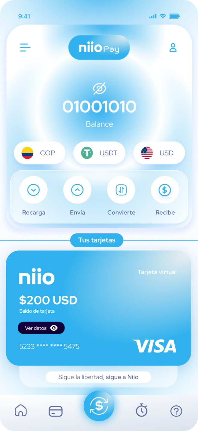 NiioPay es mucho más que un simple criptobanco. Es el oráculo del sistema financiero, el lugar donde tus decisiones son lo más importante. Gestiona, intercambia y gasta tu dinero en USD, COP o USDT con total libertad. Gracias a nuestra plataforma digital avanzada, tienes el control total para ingresar, intercambiar, retirar y gastar, todo desde la palma de tu mano.